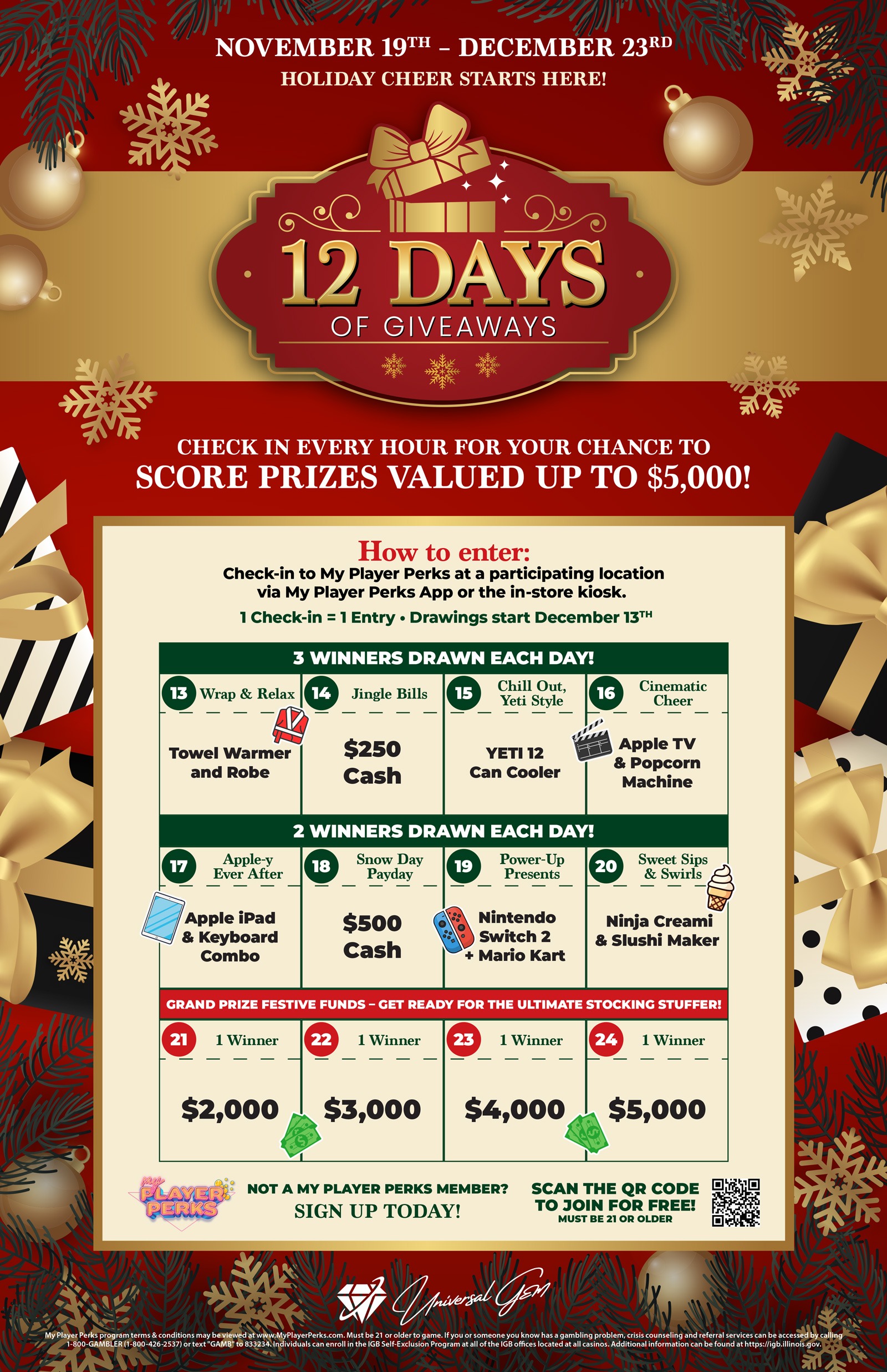 We’re thrilled to offer our annual 12 Days of Giveaways promotion! This year, My Player Perks members can win prizes valued up to $5,000.